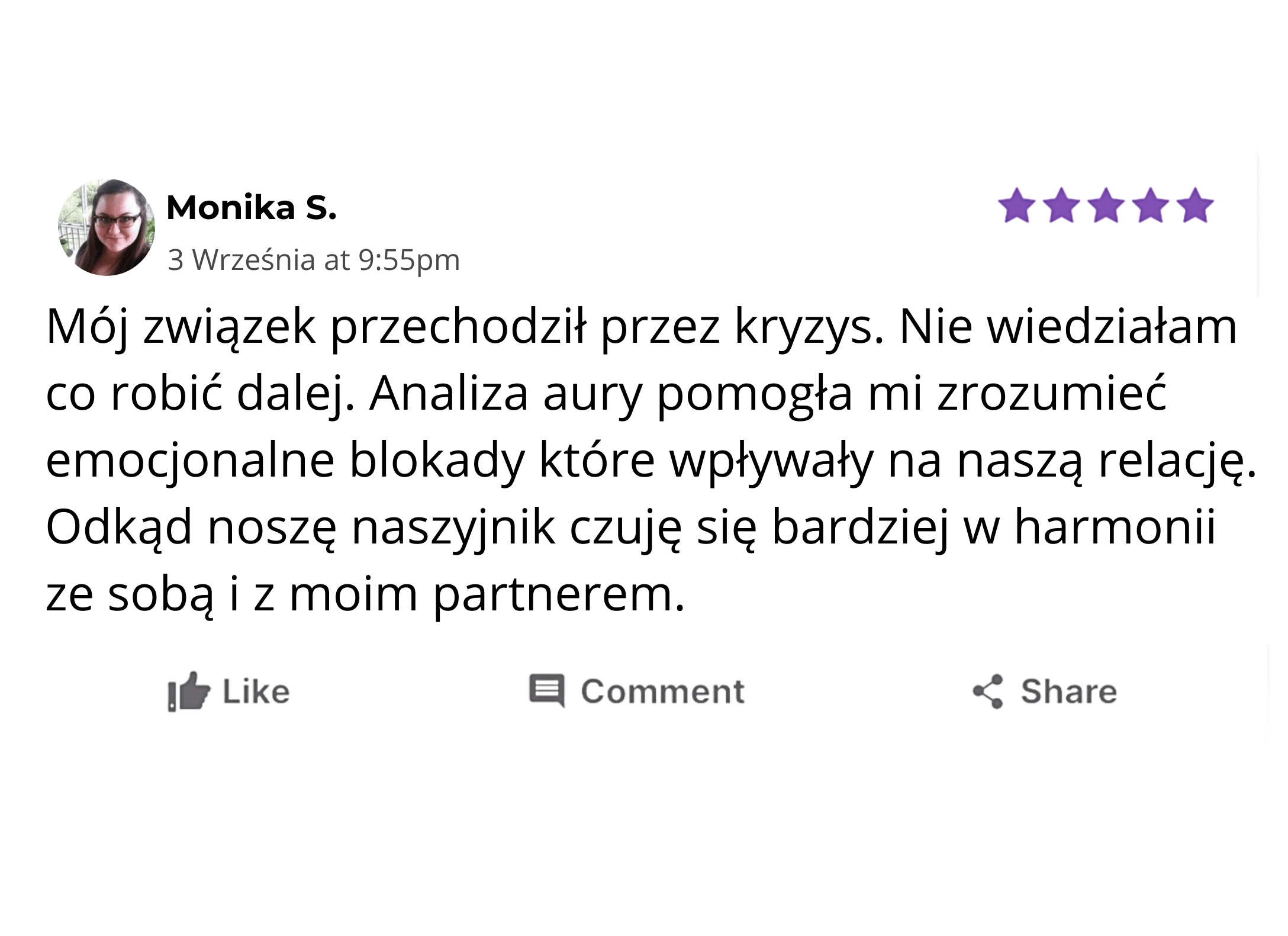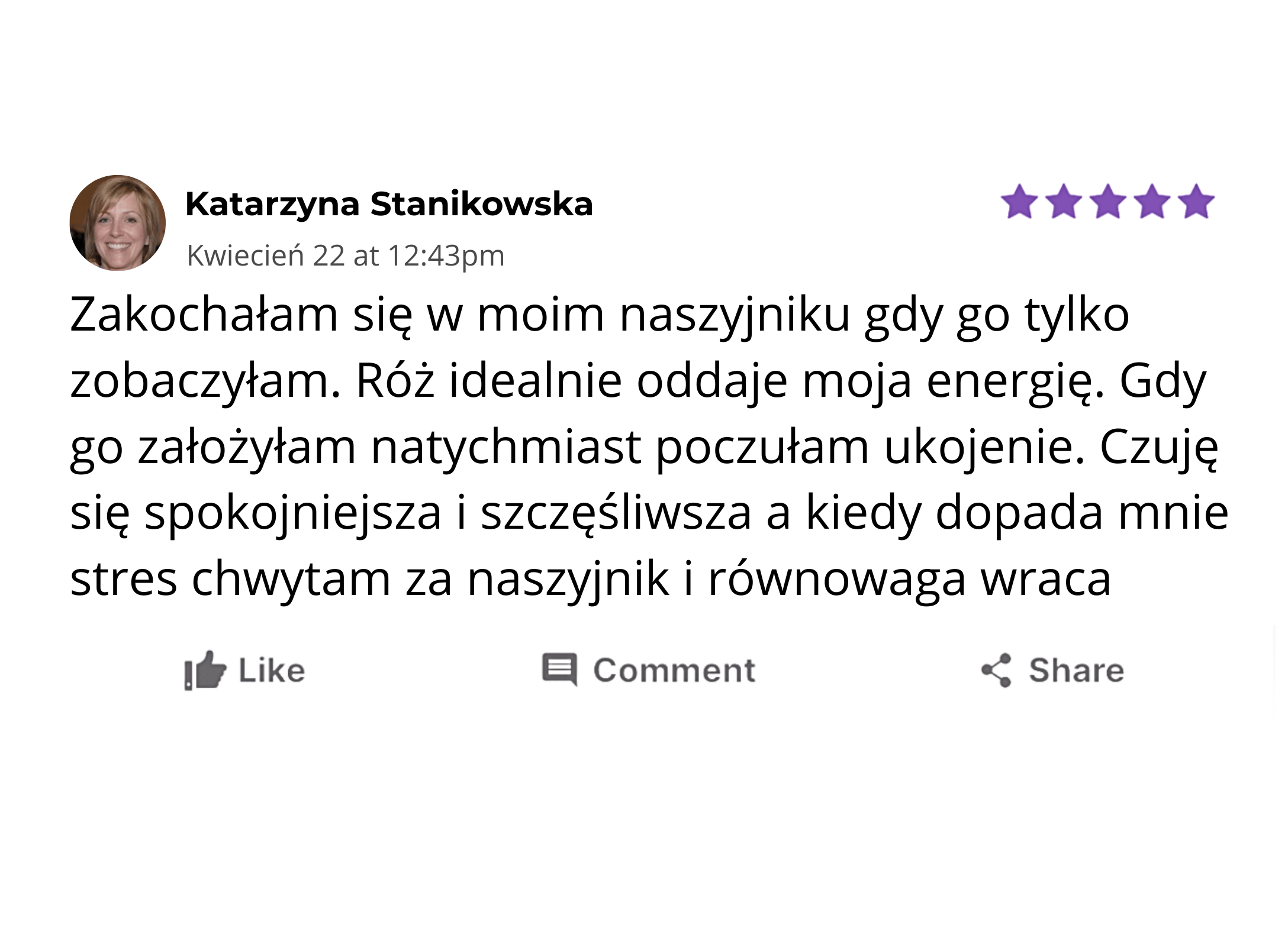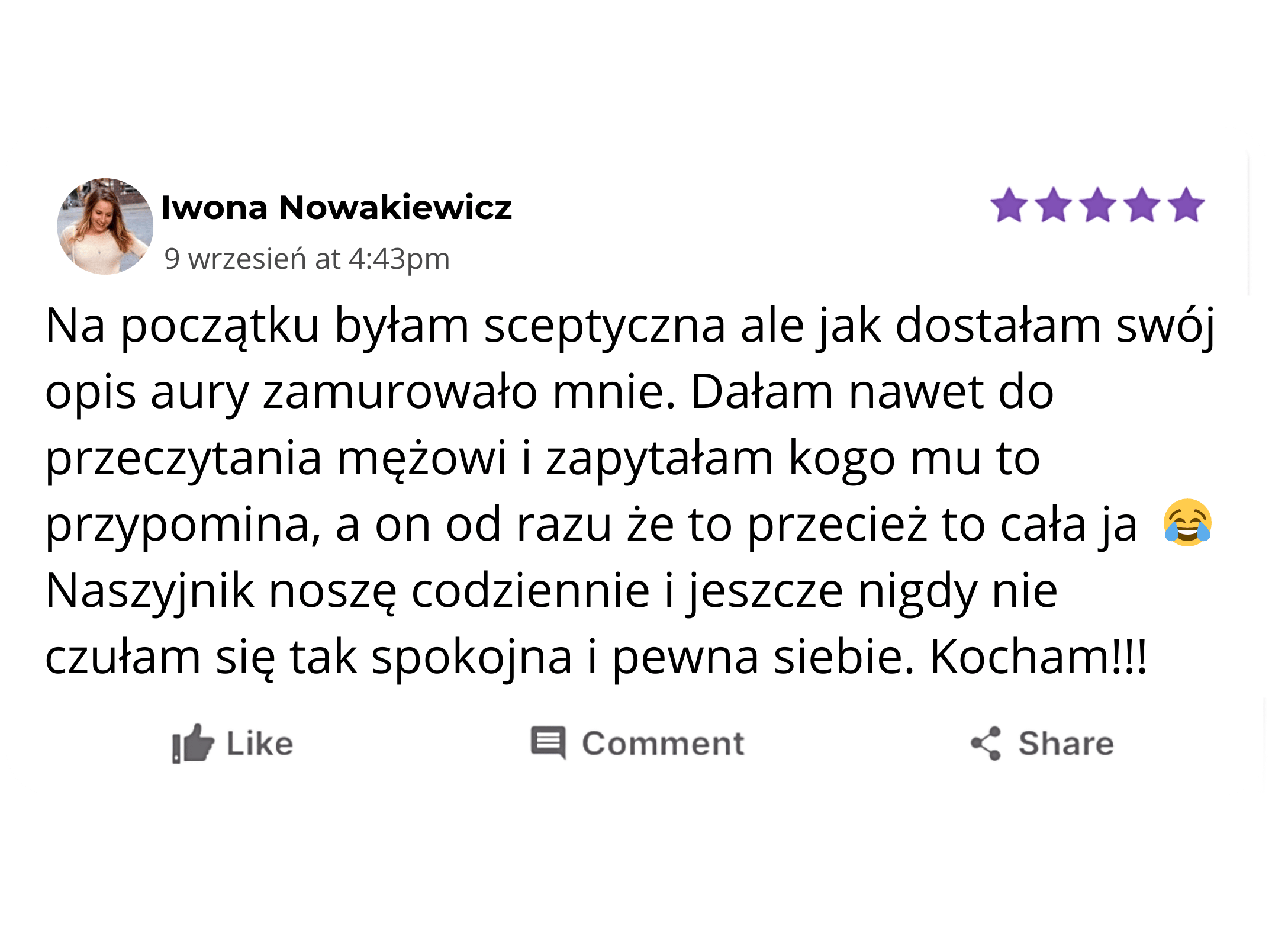 ,,Nie wiedziałam czego się spodziewać ale opis aury okazał się niesamowicie trafny. Ujął w słowa uczucia, które czułam od lat ale nie umiałam nazwać. Naszyjnik jest piękny noszę go codziennie jako przypomnienie o tym kim naprawdę jestem. Polecam! ''